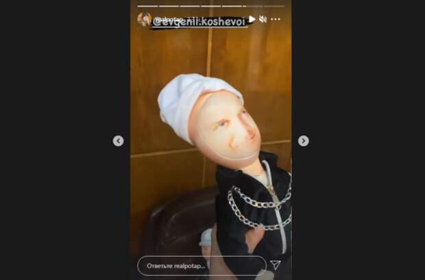 Кукла Потапа Кукла с лицом Алексея вышла очень забавной: такой же костюм, цепи и очаровательная шапочка. Похожего пупсика сделали и для Евгения Кошевого. Куда отправятся такие игрушки - не известно.